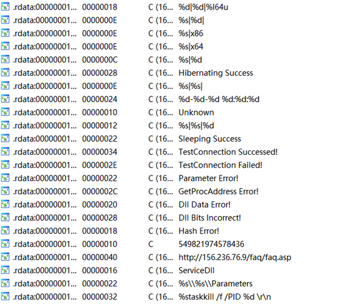该木马样本的C&C服务器为hxxp://156.236.76.9/faq/faq.asp。除此之外,样本中还出现了下载器恶意软件频繁使用的解密算法。