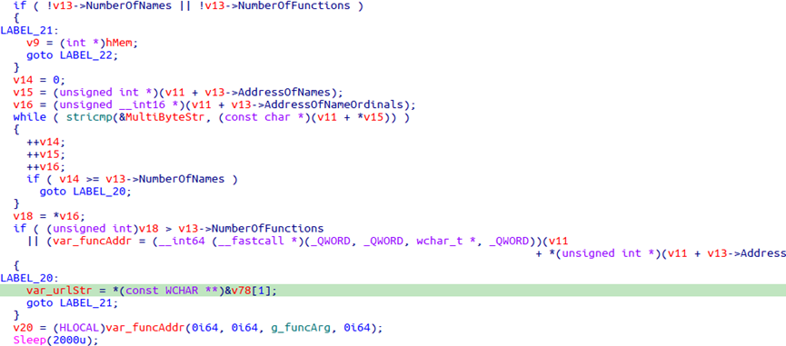 IconCache.db有两个导出函数,其中GetProcFunc为空,GetProcFuncW实现恶意功能。由于rundll32调用函数的特性[2],当传入宽字符串参数时,对GetProcFunc的调用实际会执行GetProcFuncW函数。