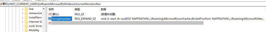 如果计划任务创建不成功,则在"HKCU\\SOFTWARE\\Microsoft\\Windows\\CurrentVersion\\Run"下添加名为"GoogleUpdate"的键值,设置的执行命令如下。