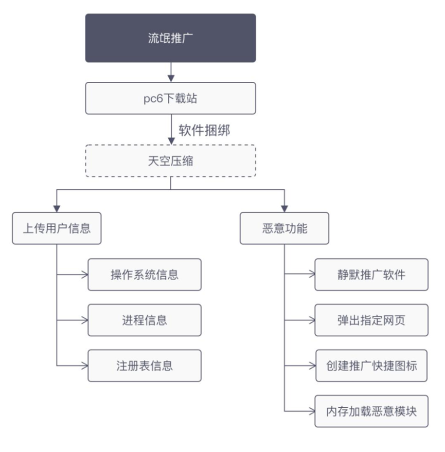 近期,研究人员收到用户反馈,在pc6下载站中下载安卓应用程序的电脑版软件时,实际安装的是一款名为“云即玩”的模拟器,并且该模拟器会捆绑流氓软件“天空压缩”。经过火绒安全人员分析,发现该流氓软件可以执行后台静默安装、创建推广快捷方式、弹出指定网页等各种恶意行为,对用户构成较大的威胁。