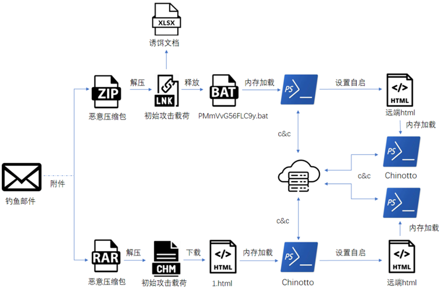近期,研究人员发现该组织托管在某网站后台的恶意攻击文件,涉及携带载荷的ZIP和RAR类型的压缩包文件,这些载荷通过释放或远端加载恶意脚本,进而无文件加载Powershell类型的Chinotto木马进行窃密行动,并且加载的木马远控指令有所增加,说明该组织在不断优化更新其载荷,以达到窃密目的。