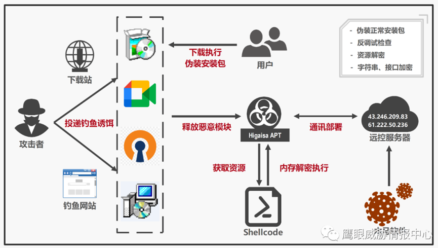 近期,研究人员留意到 Cyble 研究情报实验室最新发布的 Higaisa APT 威胁活动报告。根据报告内容,该组织采用了仿冒 OpenVPN 官网的手段,在针对中国网民的钓鱼网站上传送了恶意安装包。我们通过鹰眼威胁情报中心又发现了该组织的其他多个钓鱼活动,攻击主要将恶意模块与多个常规软件进行捆绑,伪装成正常安装包并通过钓鱼网站、下载站等途径传播。这些安装包在外观设计上与正规软件极为相似,从而有效地诱使用户进行下载安装。用户一旦在本地设备执行,攻击者便可以植入恶意模块并建立后门,再通过后门远程控制受害者计算机、部署木马软件等操作。