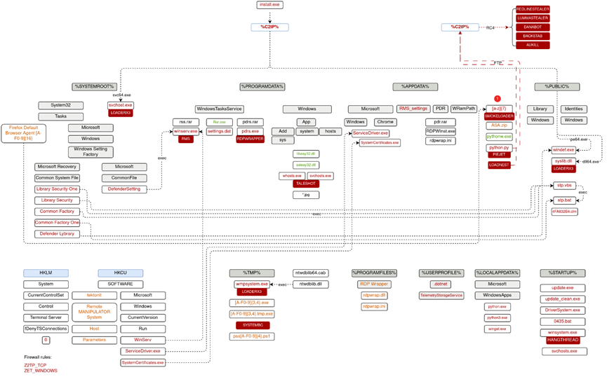其中SMOKELOADER等加载器类型程序会下载并运行其余恶意程序,TALESHOT则定期向攻击者发送指定程序的屏幕截图,攻击者指定的程序有乌克兰天然气银行、网上银行等。攻击者在接收到这些信息后,将筛选其感兴趣的受害目标,并将RMS、LOADERX3、RDPWRAPPER程序集部署到受害主机上,从而进一步控制受害主机并收集信息。攻击者最终可独立发起未经授权的付款,并将已更改好的文件信息发送给相关主管进行签名。