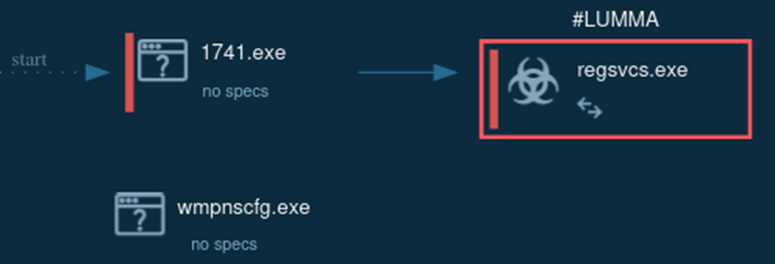 进一步调查发现,此次攻击中使用的恶意软件为LUMMA,它是一种基于C语言编写的InfoStealer,通过恶意软件即服务模型进行分发。在此恶意软件攻击中,涉及三个进程的执行:"1741.exe"、"RegSvcs.exe"和"wmpnscfg.exe"。其中,第一个进程"1741.exe"从用户的临时文件夹中执行。第二个进程"RegSvcs.exe"从Microsoft.NET Framework文件夹执行。第三个进程"wmpnscfg.exe"则从Windows Media Player文件夹执行。