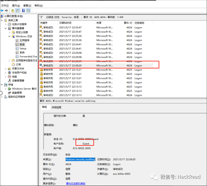查看服务器系统日志,5月17日晚10点12开始出现大量guest登录失败以及登录成功事件