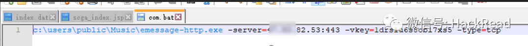 在c盘的用户/公用,目录下找到恶意文件运行的脚本,并且打开后可以看到这个脚本在调用emessage-http.exe工具,并且回连到恶意IP,找到第六个攻击IP。以及通过PsExec64.exe进行提权操作。