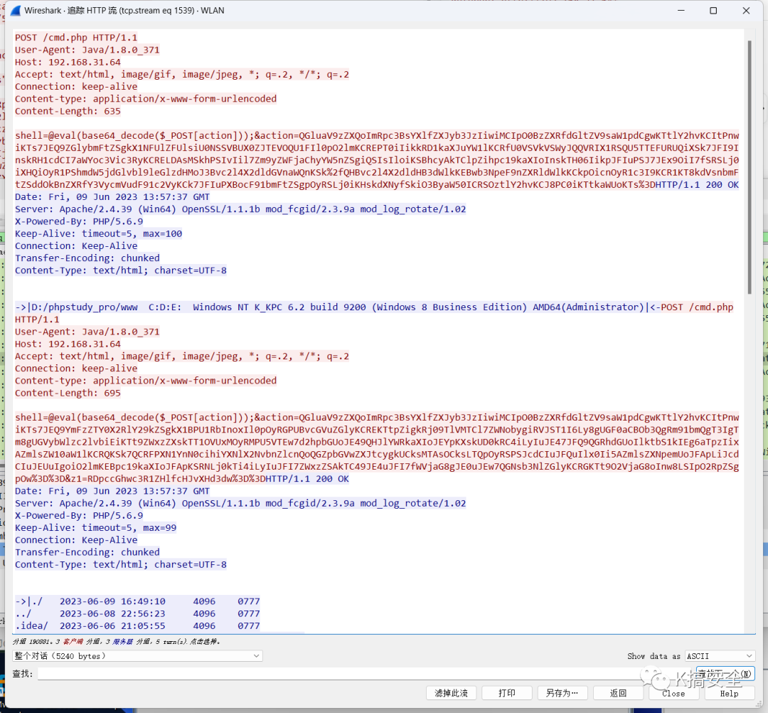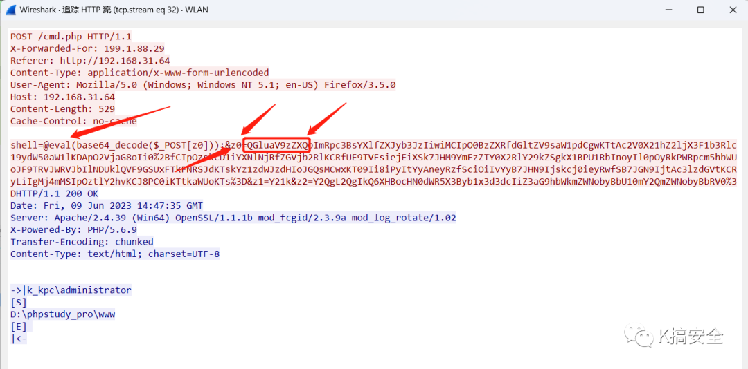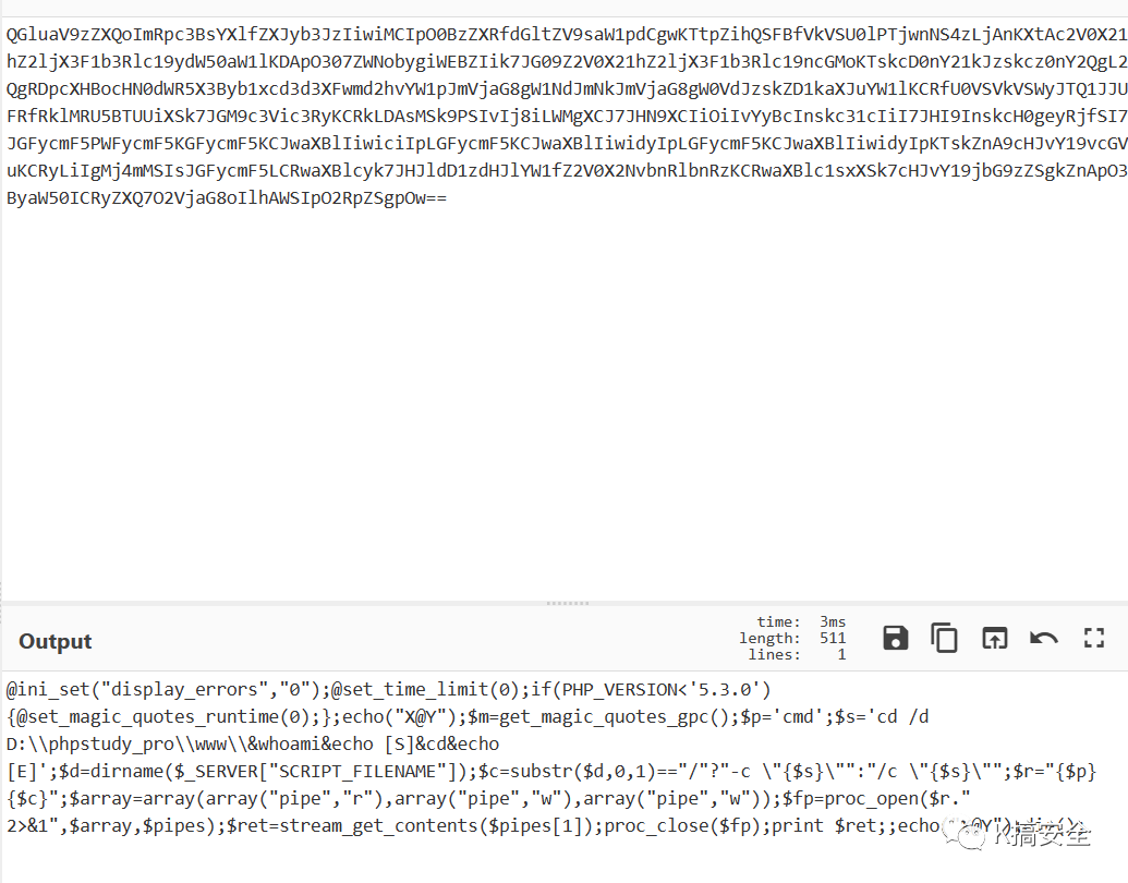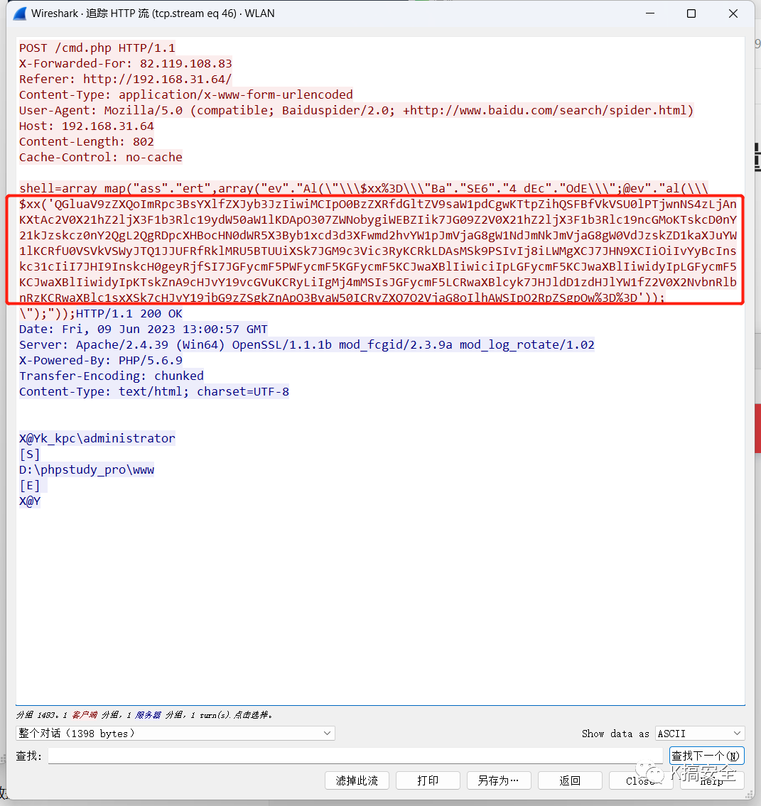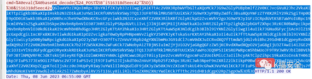 使用base64加密的,数据包存在以下base加密的eval命令执行,数据包的请求内容存在这几个分段内容,使用的base加密,解密后可以看到相关的路径,命令