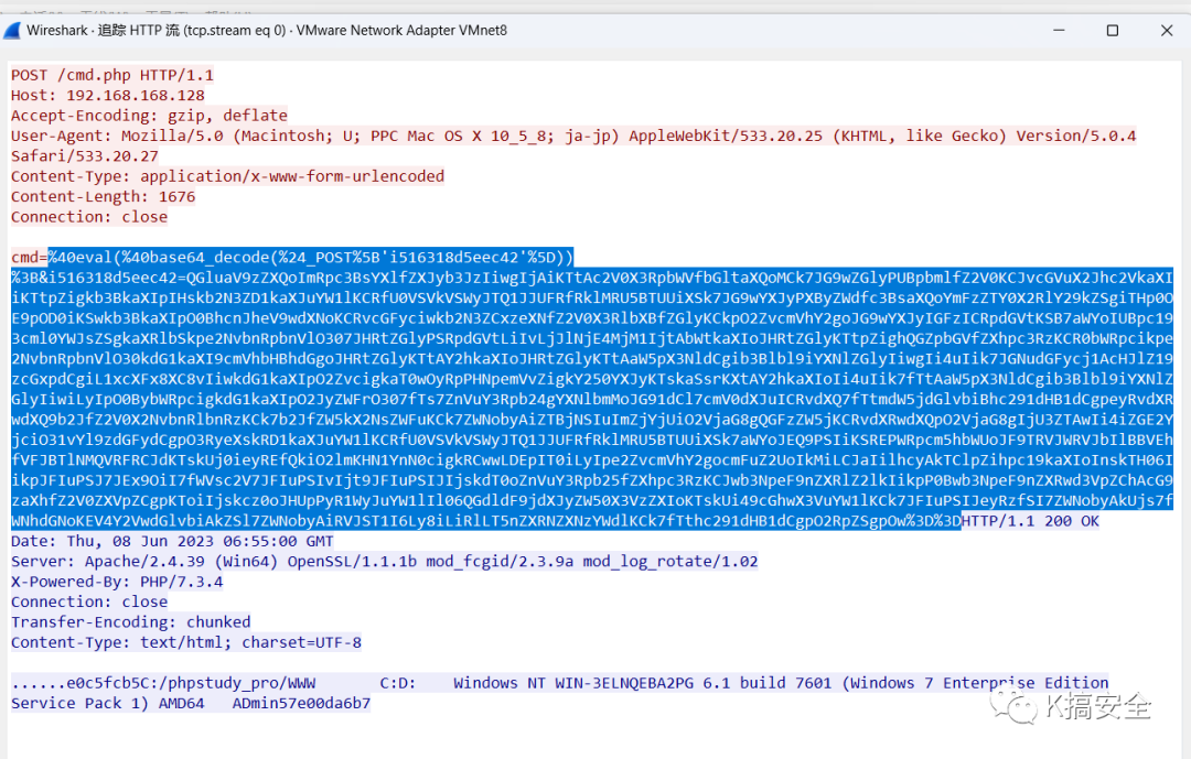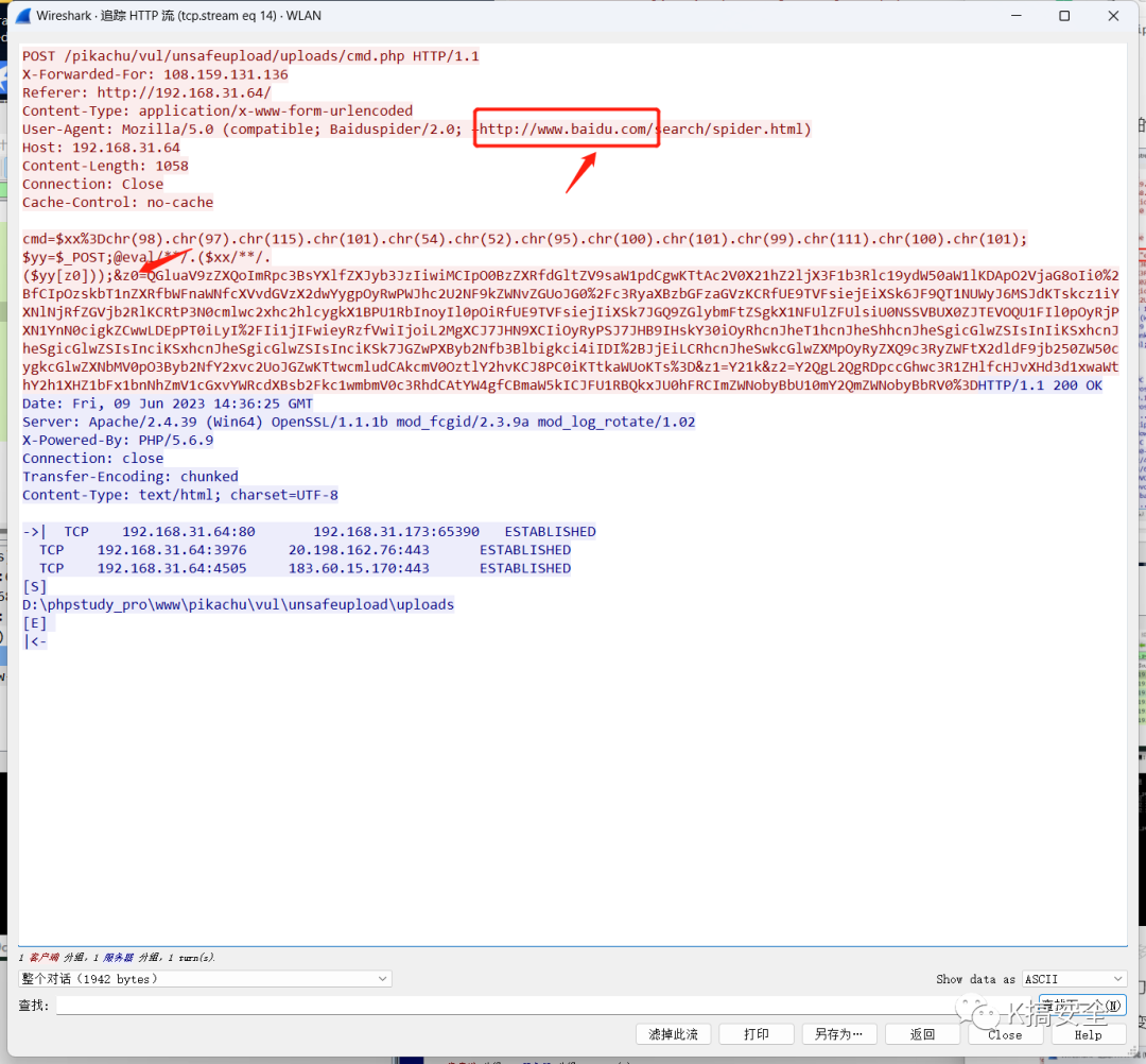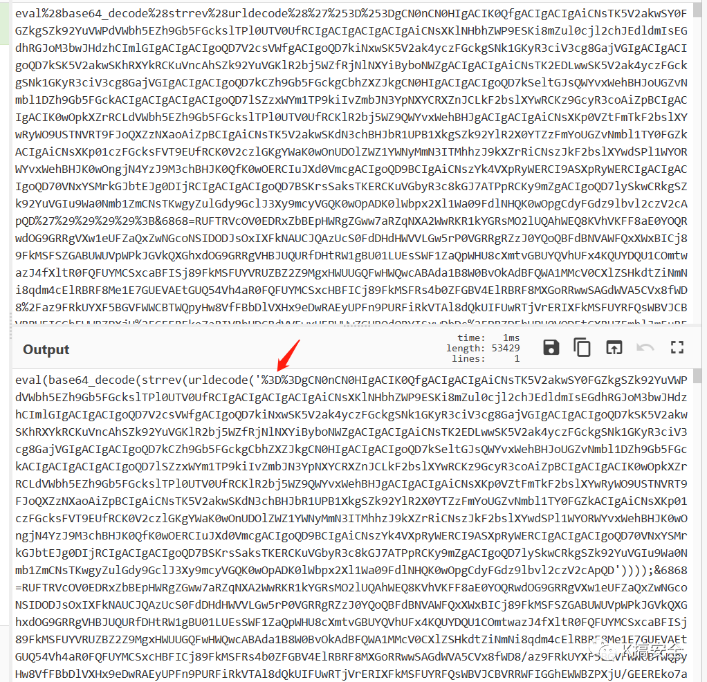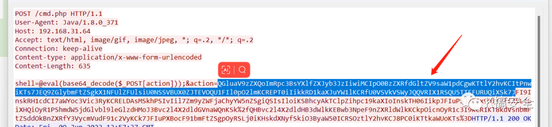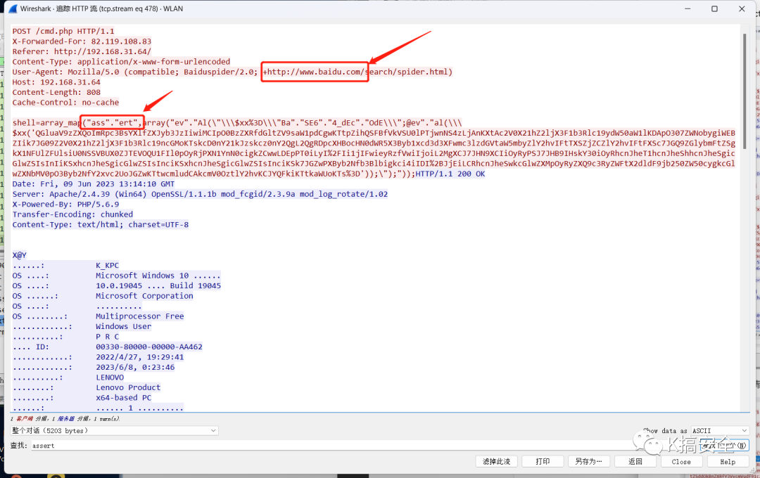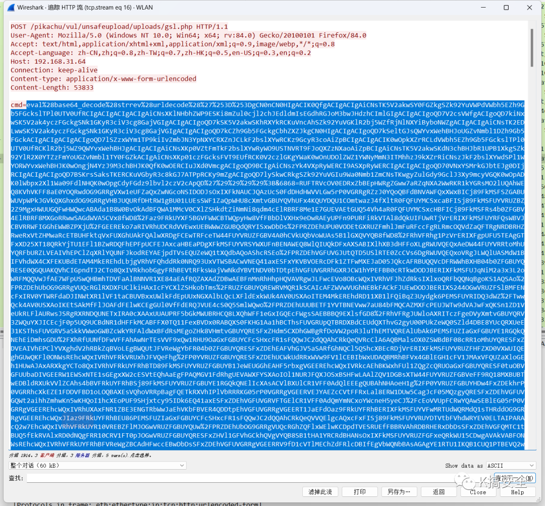 使用base64加密的,数据包存在以下base加密的eval命令执行,数据包的请求内容存在这几个分段内容,使用的base加密,解密后可以看到相关的路径,命令