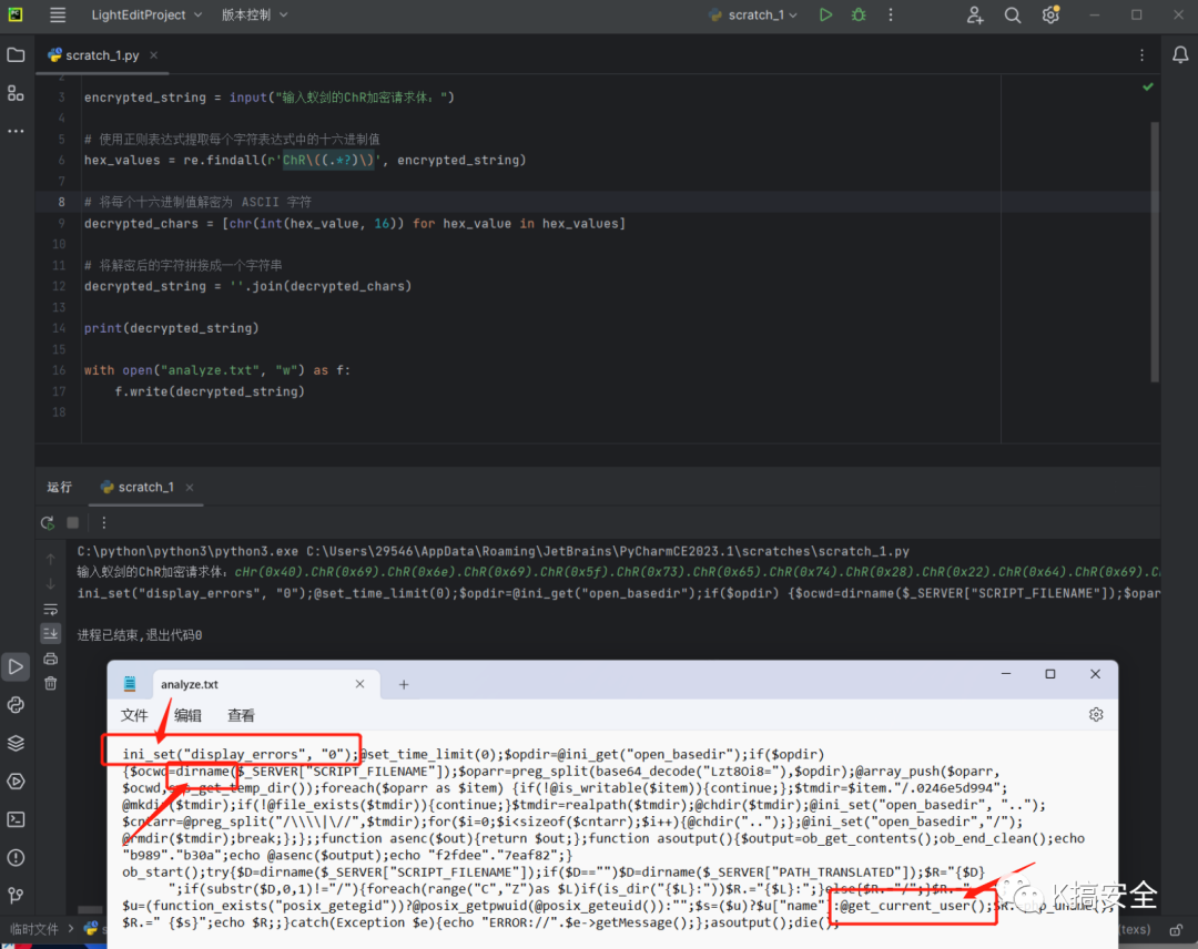 import reencrypted_string = input("输入蚁剑的ChR加密请求体:")# 使用正则表达式提取每个字符表达式中的十六进制值hex_values = re.findall(r'ChR\((.*?)\)', encrypted_string)# 将每个十六进制值解密为 ASCII 字符decrypted_chars = [chr(int(hex_value, 16)) for hex_value in hex_values]# 将解密后的字符拼接成一个字符串decrypted_string = ''.join(decrypted_chars)print(decrypted_string)# 保存输出内容with open("analyze.txt", "w") as f:f.write(decrypted_string)