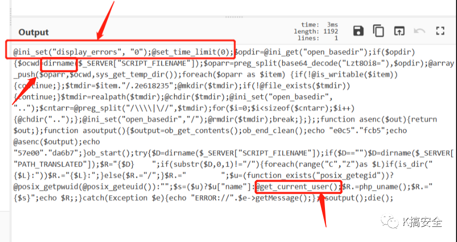 可以看到@ini_set("display_errors", "0");@set_time_limit(0);、dirname、get_current_user、明显字段