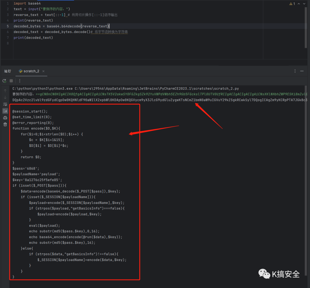 import base64text = input("要倒序的内容:")# 利用切片操作[::-1]逆序输出reverse_text = text[::-1]print(reverse_text)decoded_bytes = base64.b64decode(reverse_text)# 将字节流转换为字符串decoded_text = decoded_bytes.decode()print(decoded_text)