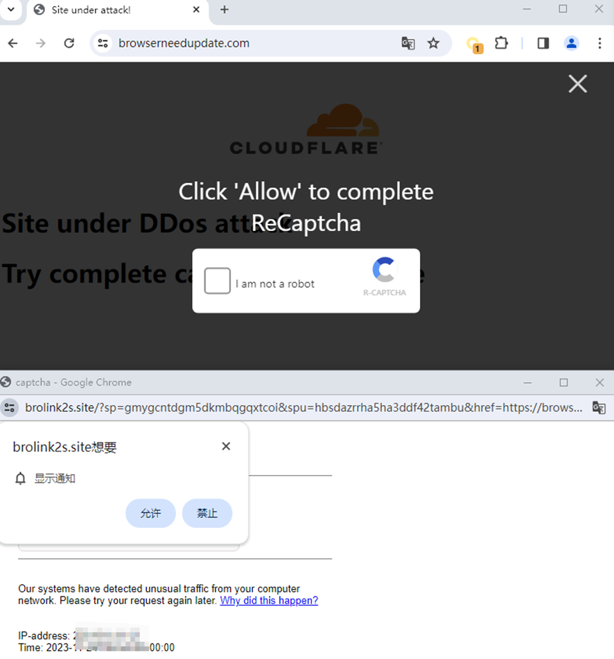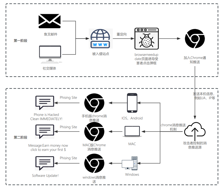 在十月份时我们检测到在访问analiticaderetail.com时直接跳转到了browserneedupdate.com页面,经过我们的分析,这是攻击者另一套攻击链,基于chrome浏览器消息推送机制的社工攻击链,攻击流程如下: