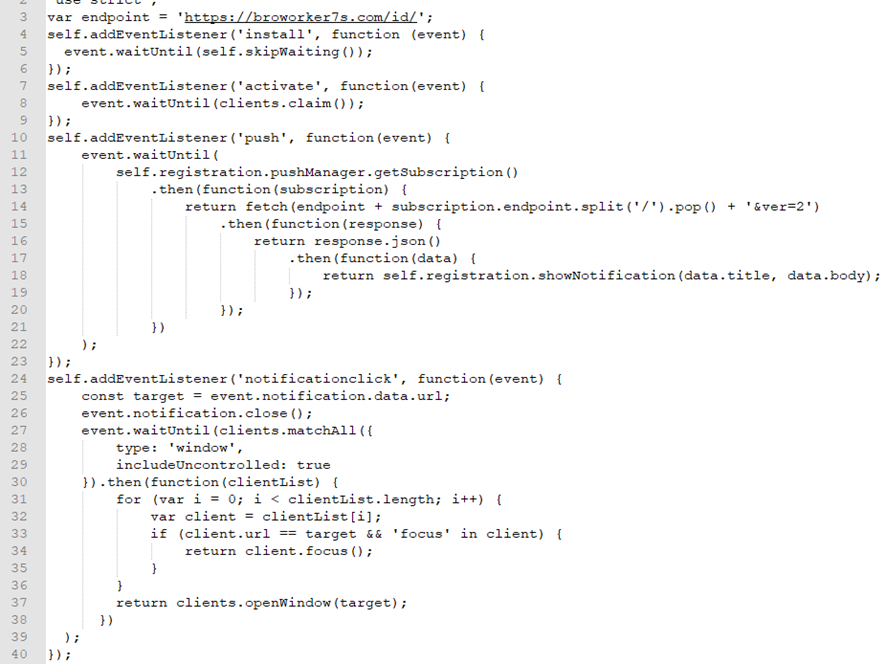 点击后会新启动一个页面并跳转到brolink2s.site域并加载一个JS,JS主要功能弹出显示通知并且诱导受害者点击允许按钮。