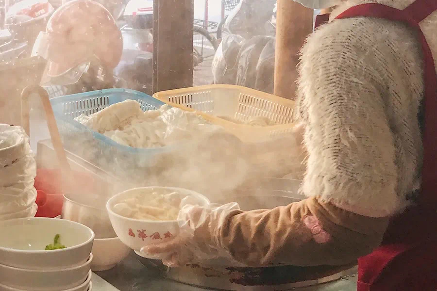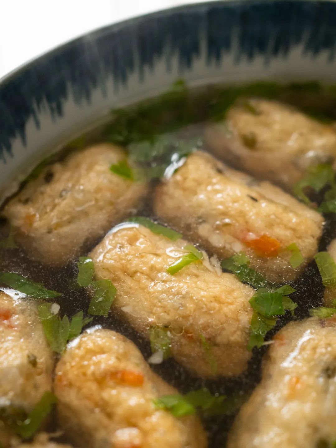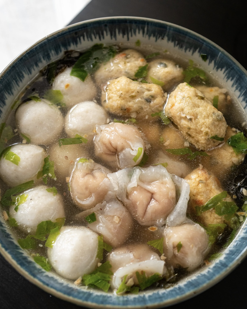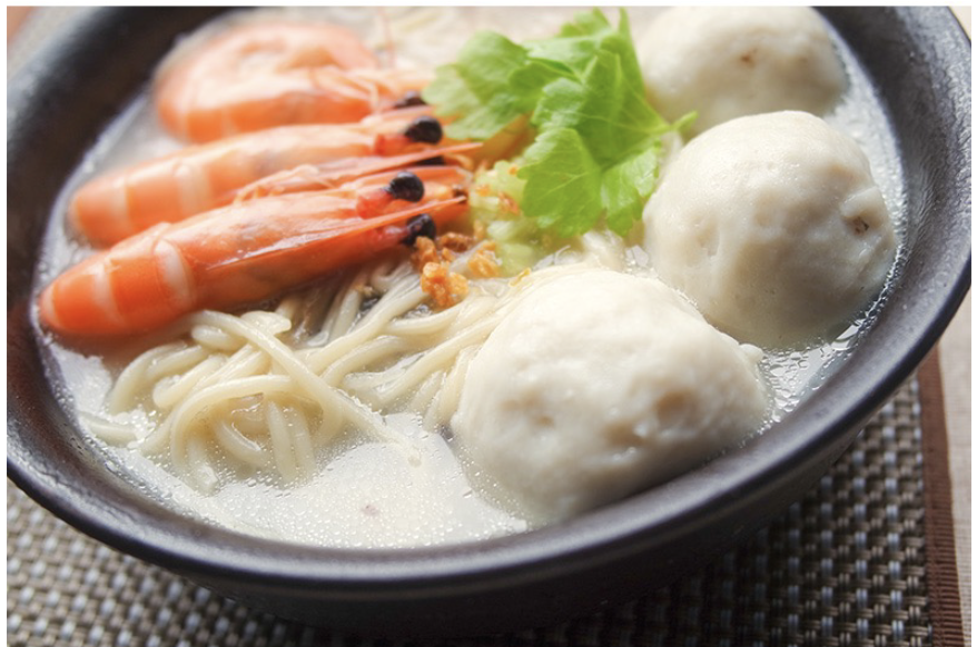 它的面皮是用鱼肉制作成的,色泽通透、还耐煮!