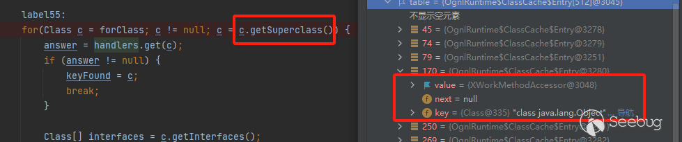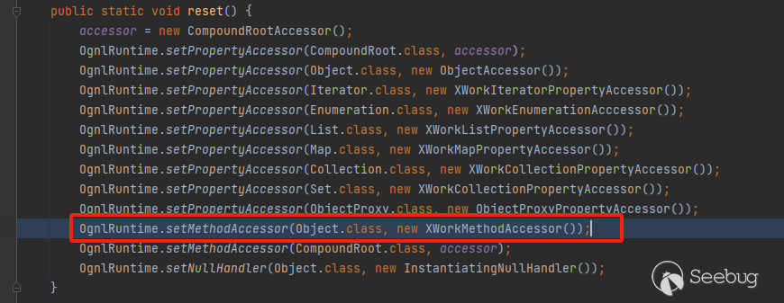 根据网上的PoC,我们可以了解到,需要将 context 的 xwork.MethodAccessor.denyMethodExecution 值设置为 false。现在我们来分析一下原因:在 Struts2 启动时,系统默认将 Object.class 的方法访问器设置为 XWorkMethodAccessor 对象,具体如图6所示。