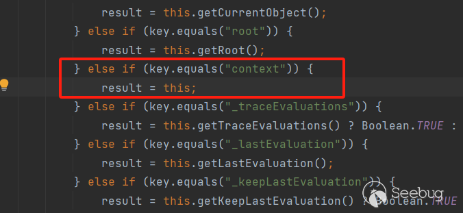 通过传入#context,会将表达式解析为ASTVarRef树类型,从而调用到ognl.OgnlContext#get方法,当key值为context时,即可获取到当前的上下文this值,#context['xwork.MethodAccessor.denyMethodExecution']=false可以操作对应的属性,如图2所示。
