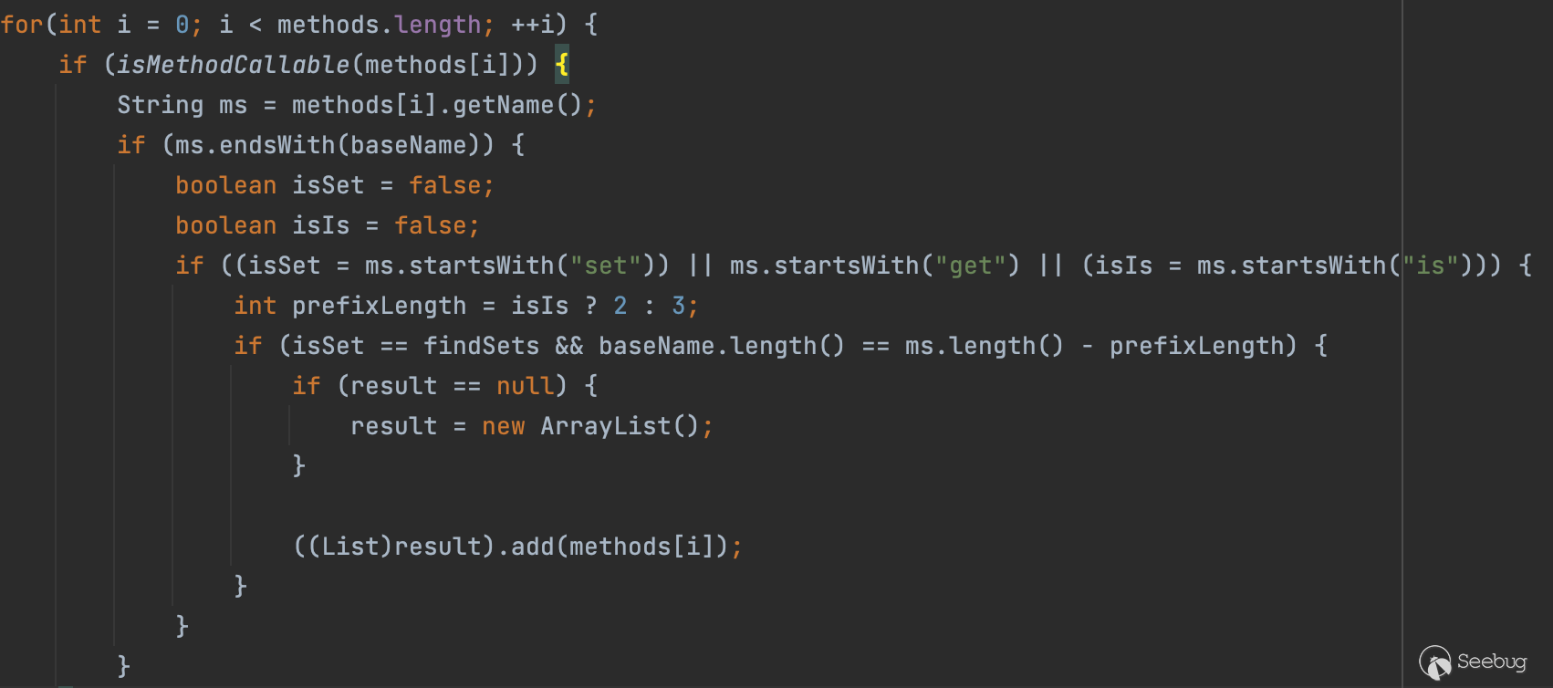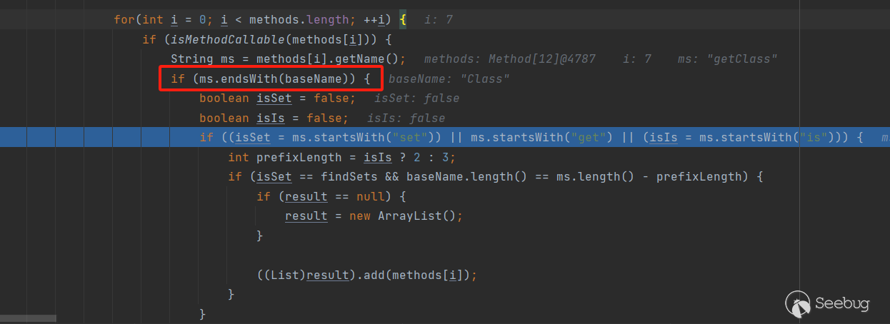 在ognl.OgnlRuntime#getDeclaredMethods中,如果传入的值以baseName结尾,则会自动匹配当前类中的set、get、is方法,如图36。
