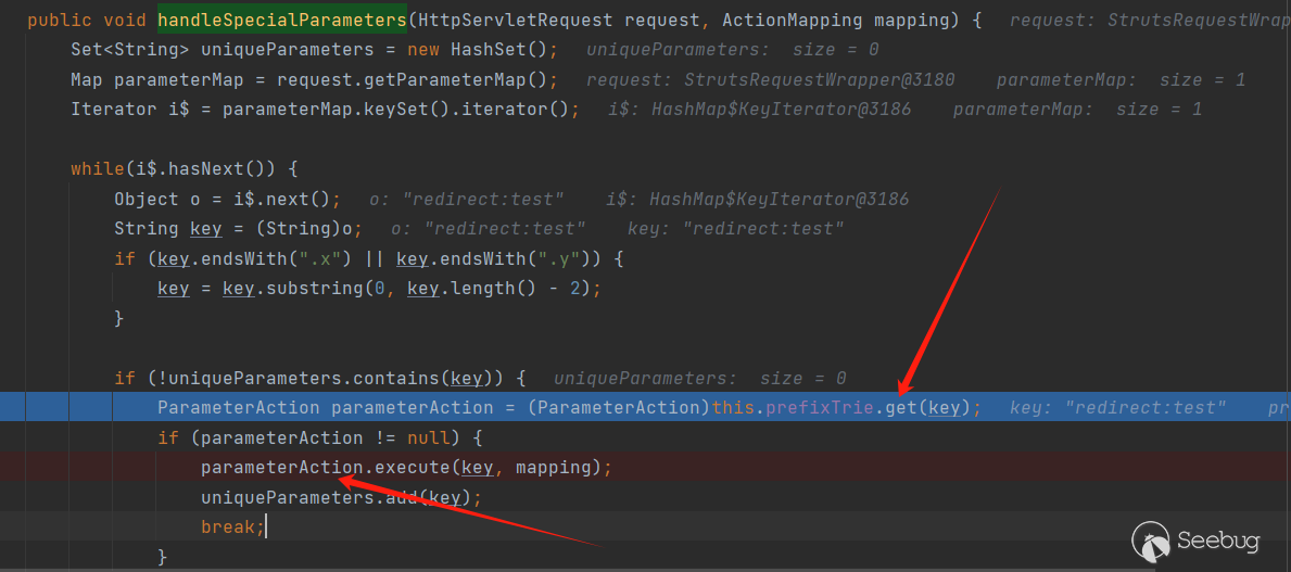 在com.opensymphony.xwork2.interceptor.ParametersInterceptor#acceptableName中,对传入的name进行了判断,具体代码如下: