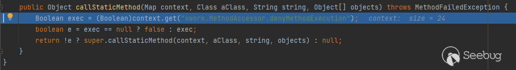 在该方法内部,通过判断 xwork.MethodAccessor.denyMethodExecution 的值是否为 false,确定是否调用后续的 callStaticMethod 方法,具体可见图9。