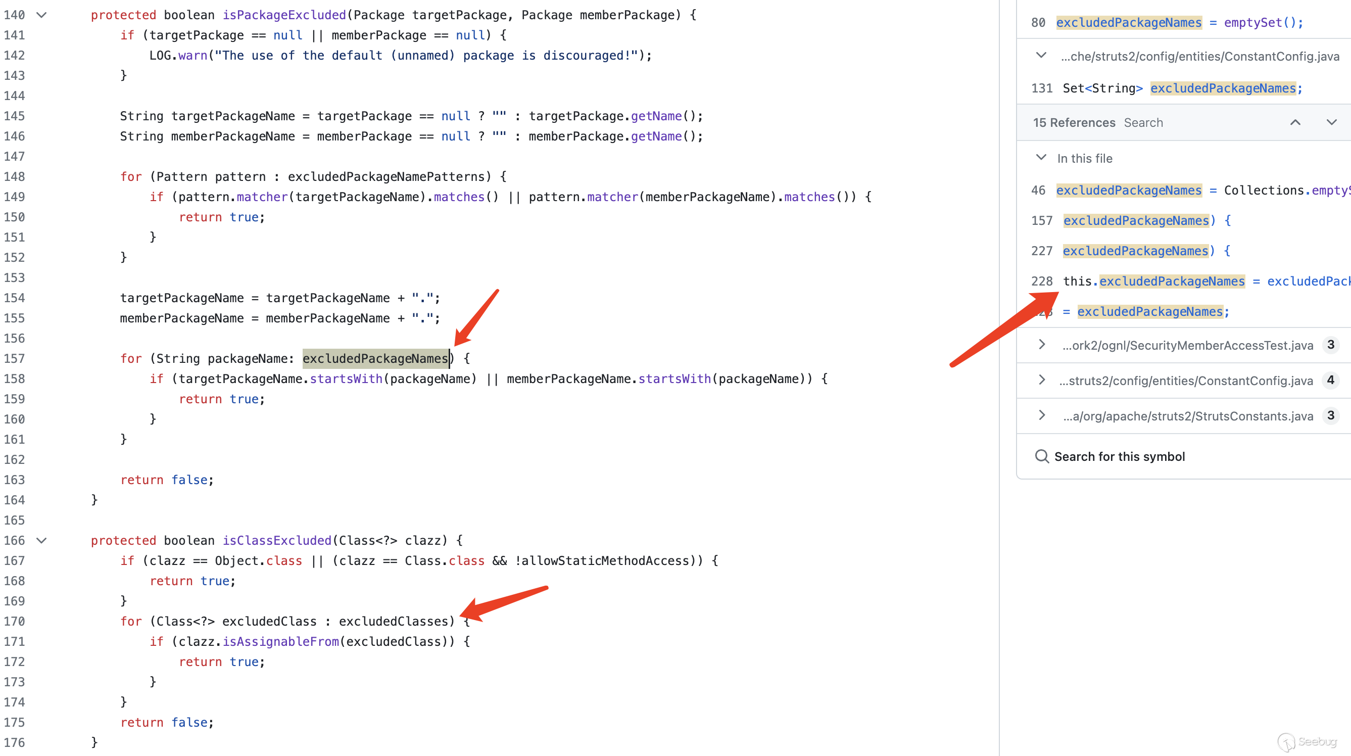 即:修改OgnlUtil.excludedClasses会影响到securityMemberAccess.excludedClasses。