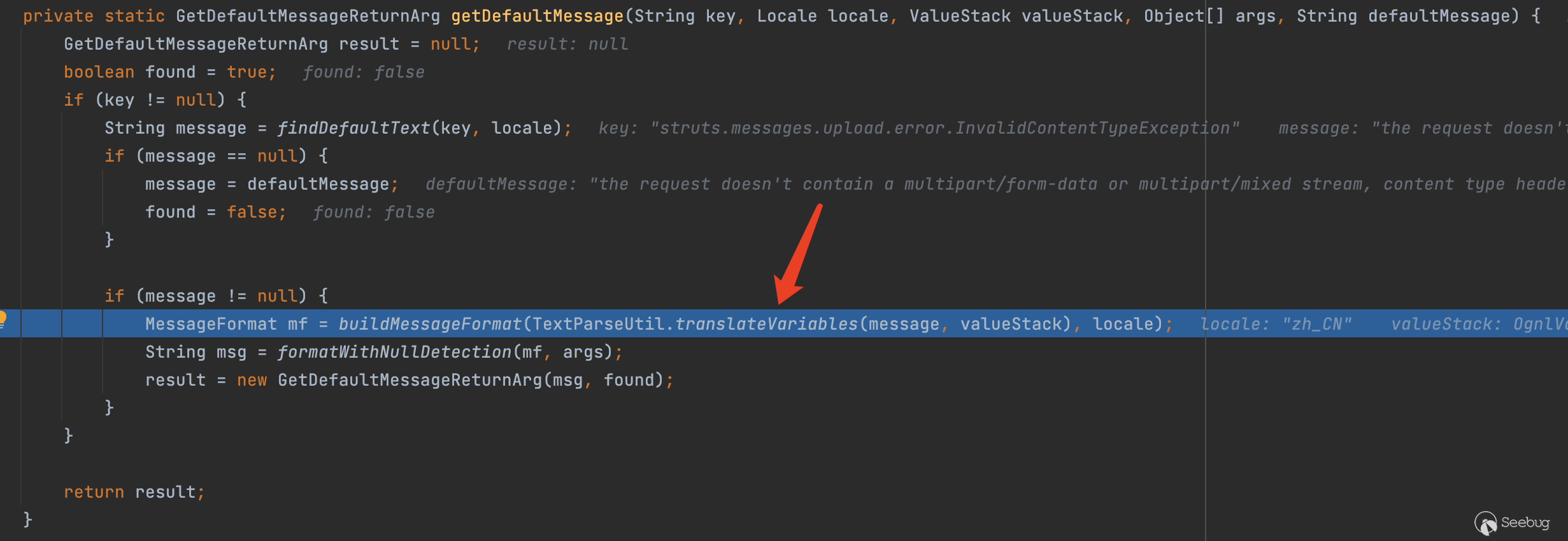 当传入非法的Content-type会引发JakartaMultiPartRequest类报错,并调用buildErrorMessage()方法处理错误contentType信息。该函数内部使用到了TextParseUtil.translateVariables去处理了报错信息,造成了OGNL表达式解析。