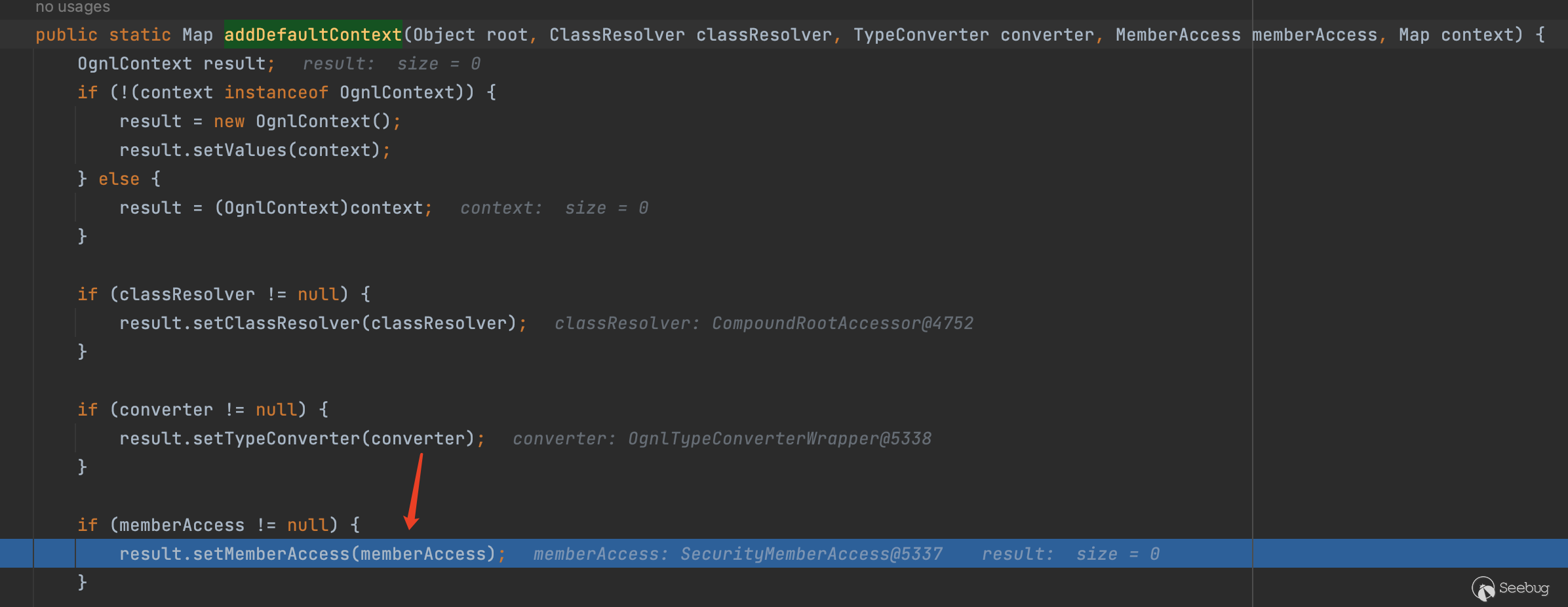 在ognl.Ognl#addDefaultContext中,将memberAccess(SecurityMemberAccess)的对象使用setMemberAccess赋值给了result(OgnlContext)时,它们实际上是引用了相同的对象。这样的操作是按引用传递的,即两个变量引用的是同一个对象,如图29。