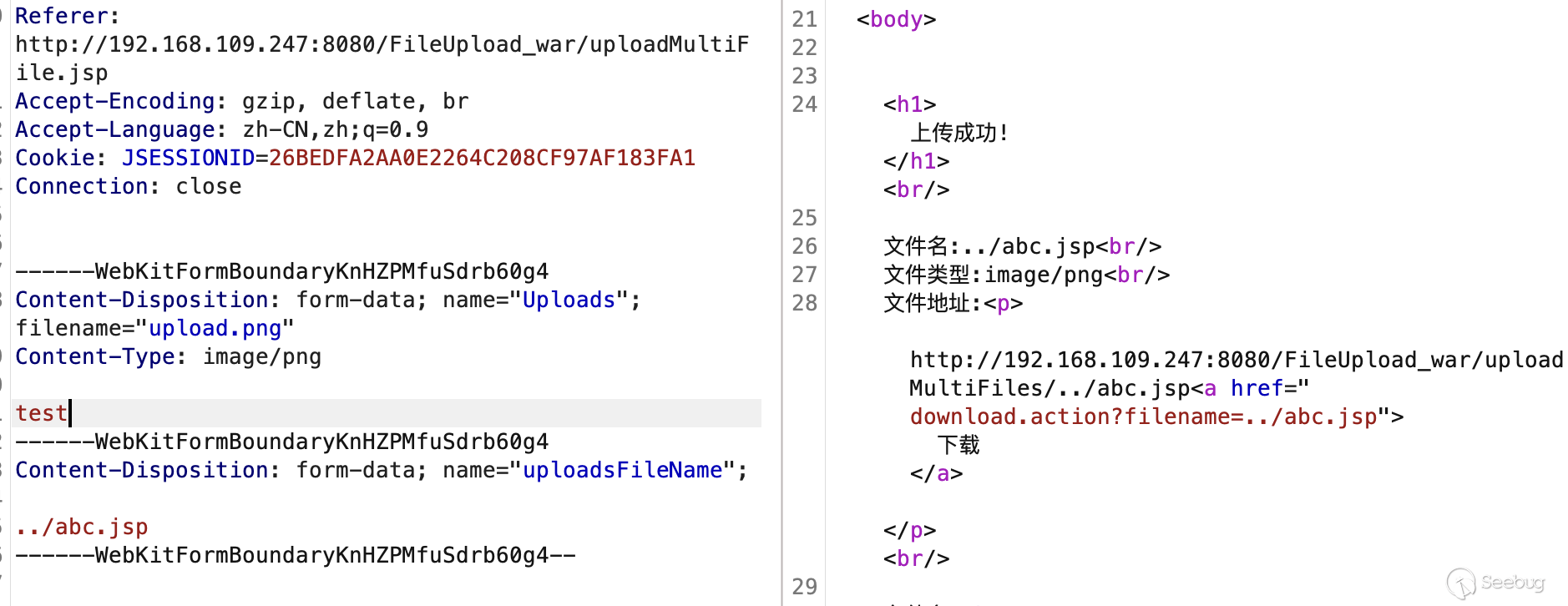 通过控制文件上传参数首字母大写,Struts2会自动匹配调用其对应的set方法,并且让后台自动生成的参数UploadFileName的首写字母为大写,又因为Treemap的排序特性,大写字母排序比小写字母在更前面,导致系统生成的UploadFileName优先赋值后,攻击者传入的uploadFileName(小写开头)覆盖了系统设置的文件名称,最终导致了目录穿越。