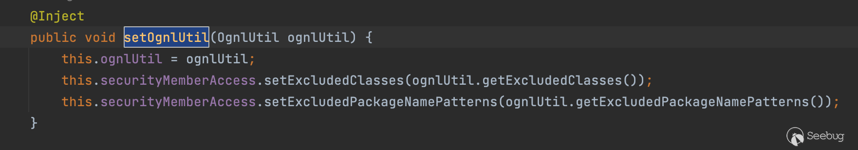 3、由上诉可知this.excludedPackageNames和this.excludedClasses可以通过OgnlUtil来操作,所以我们可以利用Container获取OgnlUtil实例并且清空SecurityMemberAccess。