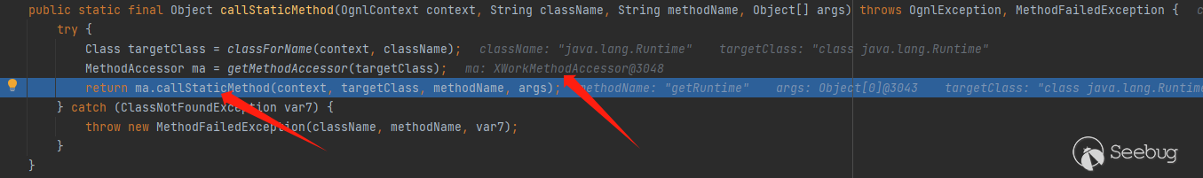 在整个过程中,最终调用了XWorkMethodAccessor 的 callStaticMethod 方法,以获取 Runtime 对象,详见图8。