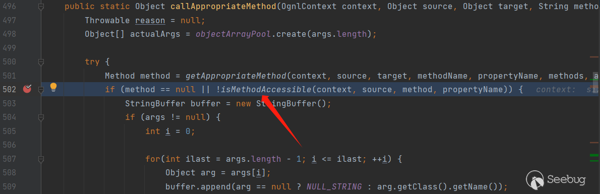 所以后续判断交给SecurityMemberAccess的isAccessible方法进行处理(默认为DefaultMemberAccess),如果传入的是ASTStaticMethod类型表达式,调用到callStaticMethod方法paramName默认为null,会引起空指针造成中断(PoC失败的主要问题),如图15:
