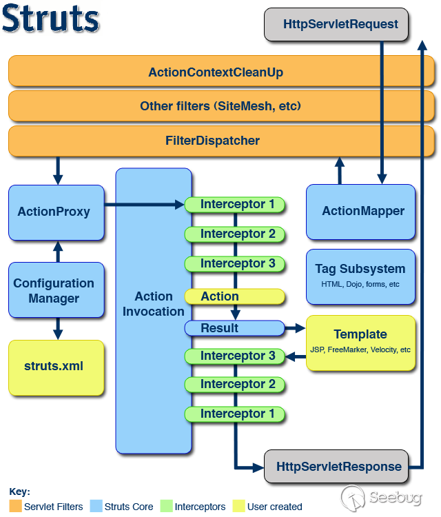 Struts 是一个开源的、用于构建企业级 Java Web 应用程序的 MVC (Model-View-Controller) 框架。它提供了一种组织和管理 Web 应用的方法,以及在应用程序的各个层次之间进行清晰划分的机制。Struts2框架大致处理流程如下: