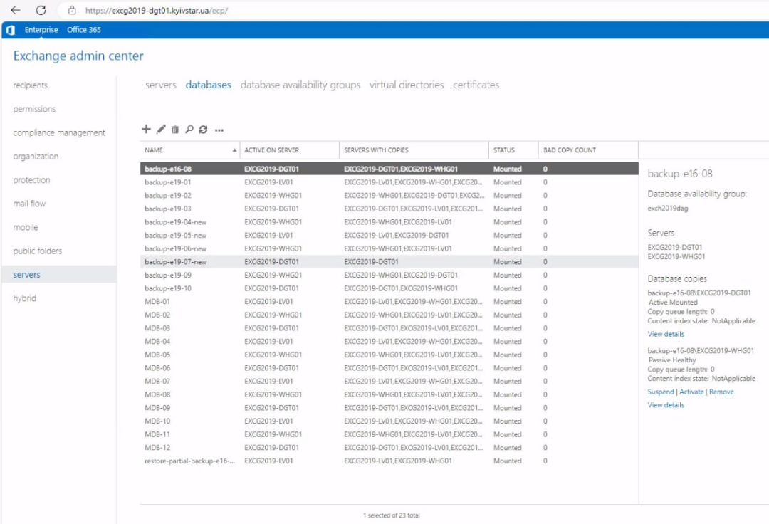 Solntsepek目前公开的5张截图如下,涉及多个服务器管理界面,其中一张出现与Kyivstar有关的Exchange服务器域名”excg2019-dgt01.kyivstar.ua”。