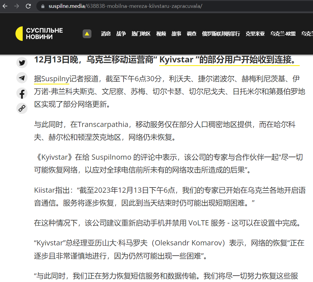 12月13日晚,Kyivstar的移动服务在乌克兰部分地区恢复,但另一些地区的网络仍未恢复。Kyivstar的CEO表示“网络的恢复正在逐步且非常谨慎地进行,因为仍然可能出现一些困难”。