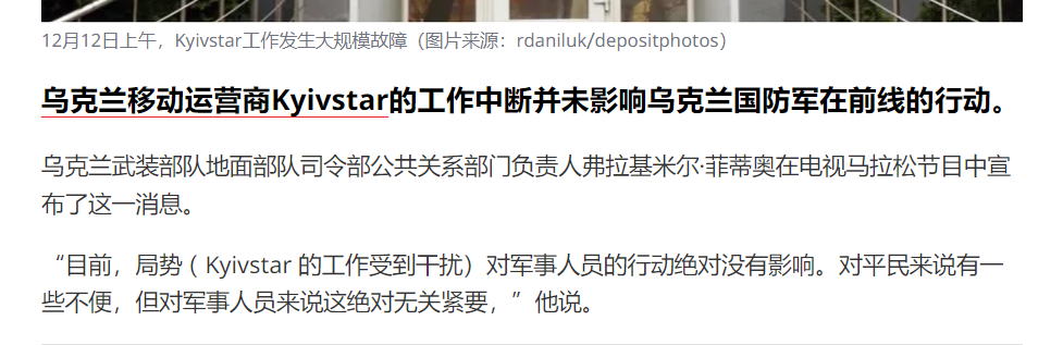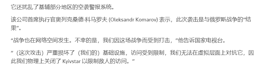 报道中提到,Kyivstar的CEO认为此次袭击是与俄罗斯战争的“结果”。攻击“严重损坏了基础设施,访问受到限制”,为应对攻击,只能“物理上关闭Kyivstar以限制敌人的访问”。
