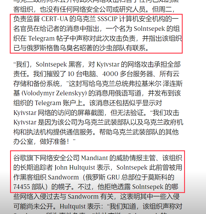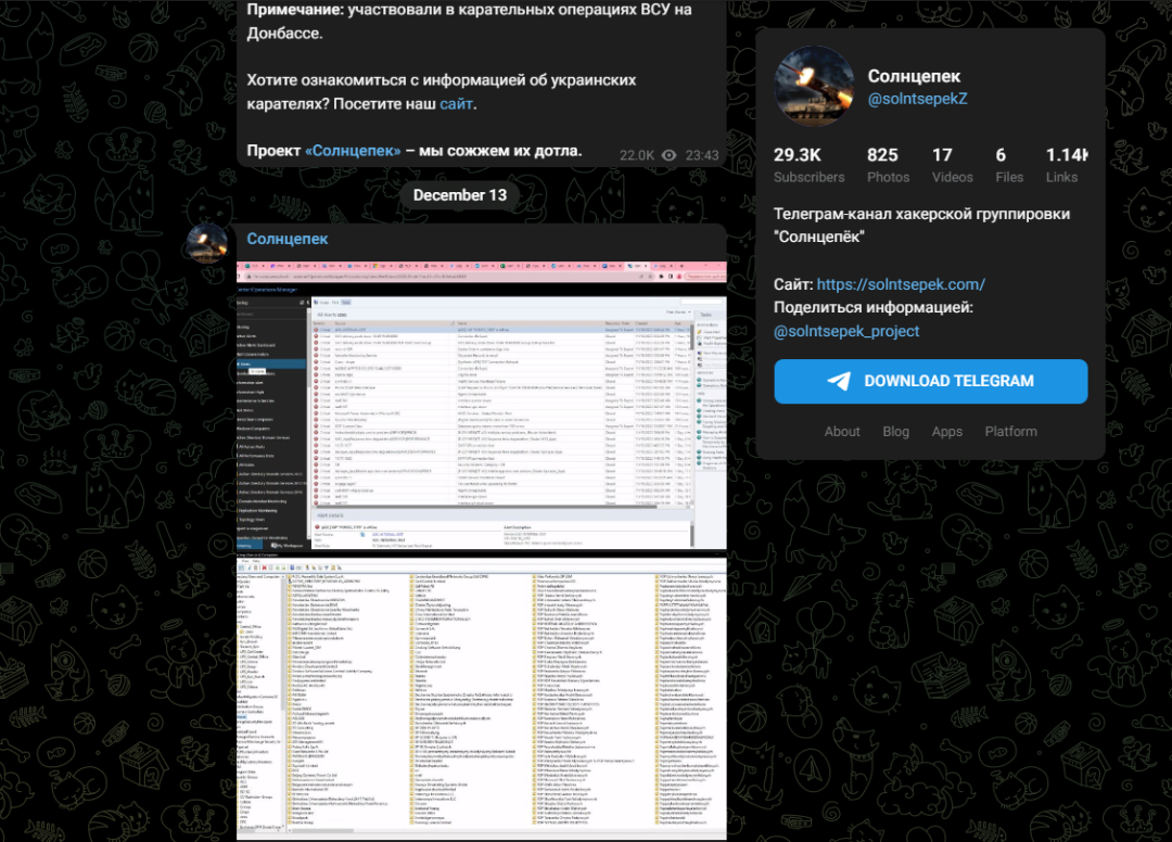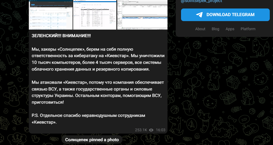 12月13日,黑客组织Solntsepek声称“对Kyivstar的网络攻击负全部责任”,并发布据称攻陷的Kyivstar相关系统的截图[4]。