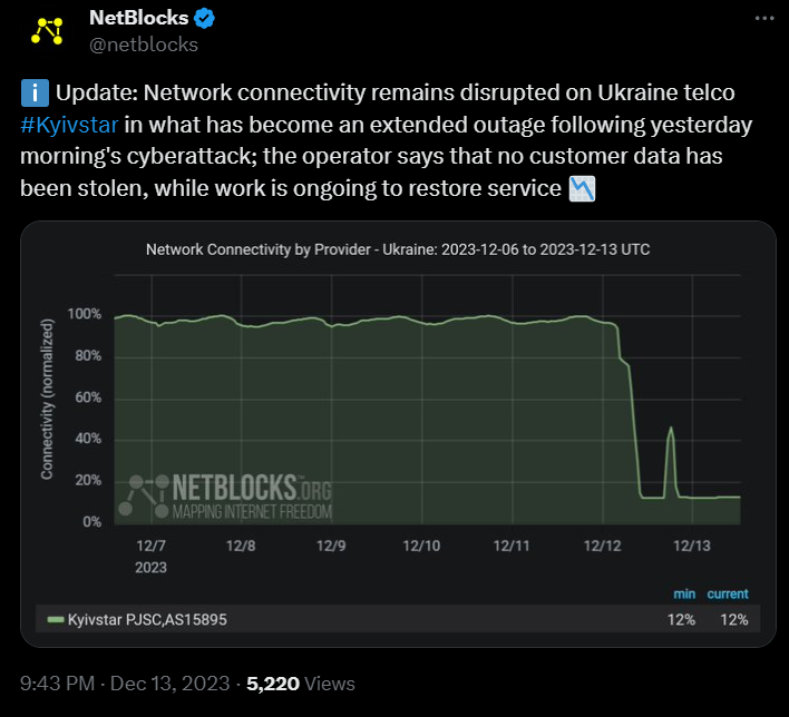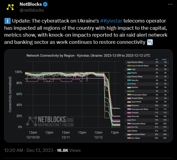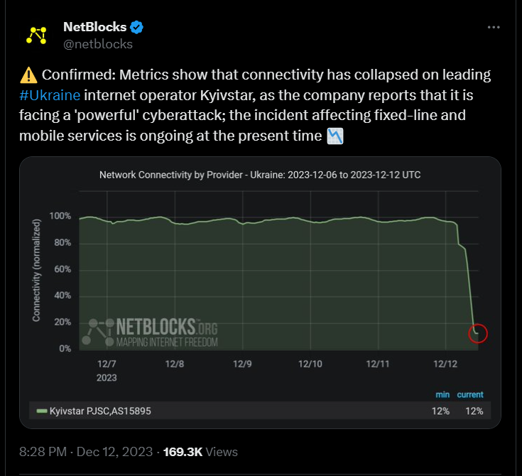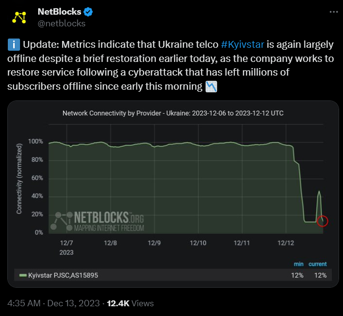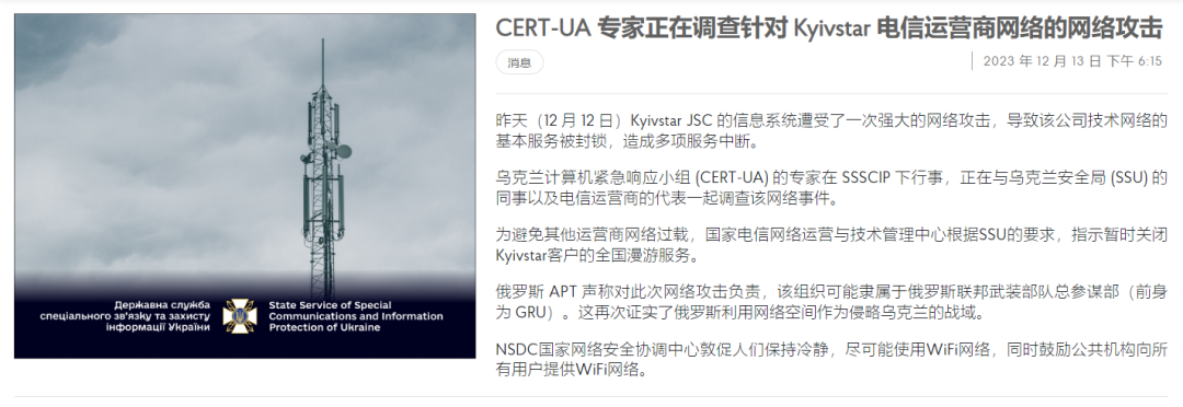 2023年12月12日,乌克兰最大的移动网络运营商Kyivstar表示遭到网络攻击[1],导致相关网络服务瘫痪,“使数百万人面临无法收到俄罗斯潜在空袭警报的危险。”
