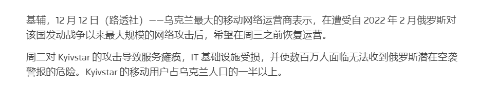 NetBlocks组织监测到Kyivstar网络连接情况在12月12日出现断崖式下跌[2],印证了网络攻击对Kyivstar的影响。