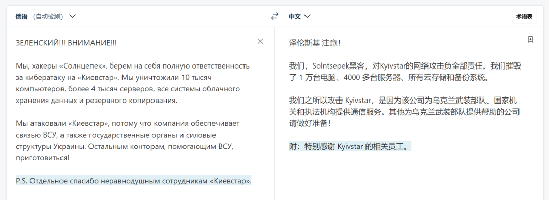 攻击者使用的具体手法暂时未知,不过Solntsepek在13日发布的声明信息暗示此次攻击可能和Kyivstar公司员工有关[6]。