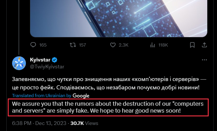 Solntsepek在声明中称破坏了10000台电脑和4000多台服务器,而在12月13日晚些时候,Kyivstar在其官方twitter账号回应此说法为谣言[5]。
