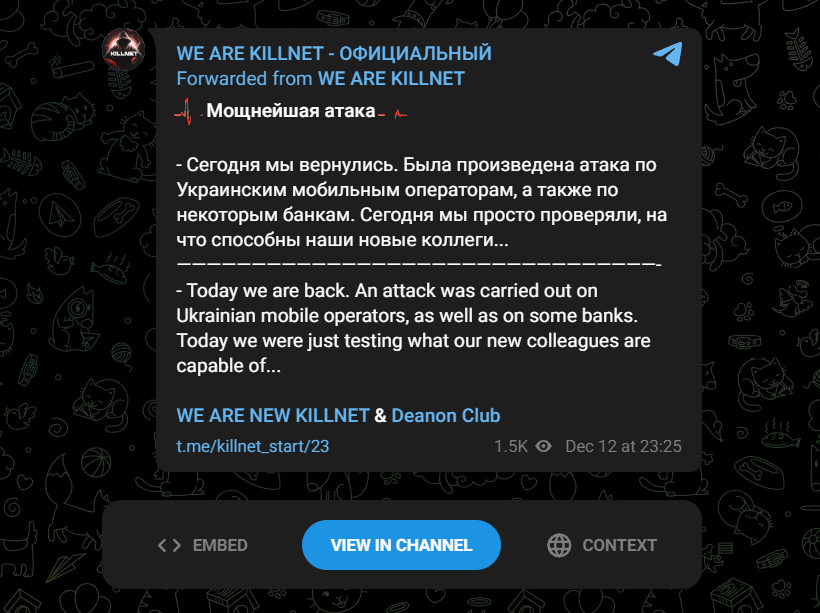 亲俄黑客组织Killnet在12月12日声称,对乌克兰移动运营商和银行进行了攻击[3],但未提及被攻击单位的具体名称,并且没有提供其参与的任何细节或证据。