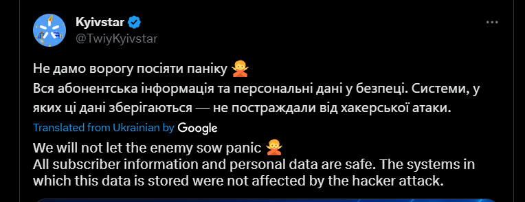 Kyivstar官方表示用户的个人信息未受此次攻击事件影响[12]。
