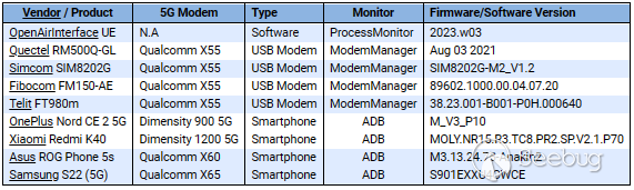 下表中包括设备的固件和软件版本信息,这些通常由供应商或通过操作系统更新进行提供。值得一提的是,“OpenAirInterface UE” 是一个软件解决方案,它不依赖于任何具体的 5G 调制解调器硬件(因此被标记为“不适用”)。