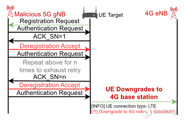这种降级攻击不仅突显了 5Ghoul 漏洞利用的能力,而且还表明它可以作为测试 5G NR 安全性的有价值工具,尤其是在分析除 DoS 漏洞之外的安全缺陷时。视频 演示了 5Ghoul 漏洞利用工具如何触发这种新型降级攻击。